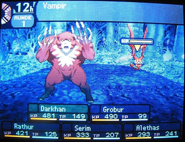Kommt es zum Kampf, schaltet das Spiel in einen Kampfbildschirm um, indem im oberen Bildschirm statisch die Gegner mit Bild, Namen und Lebensbalken und im unteren Feld die Gruppe abgebildet wird, allerdings ist im unteren Bildschirm nur die Namen, die Kraftpunkt- bzw. die Technikpunktleiste nebst Zahlenwert abgebildet, unsere Helden sind nur im Menü als Figur sichtbar. Die einzelnen Charaktere können sich dann in Ruhe ihre Optionen wie Angriff, Fähigkeitsauswahl, Abwehr, Gegenstände oder Flucht für den bevorstehenden Kampf überlegen, nach Auswahl wird der Kampf dann ausgeführt. Der schnellste, das heißt, der Charakter oder Gegner mit der höchsten Agilität beginnt, danach folgen die langsameren Figuren mit ihren Aktionen. Der Gegner agiert dabei recht wahllos und greift nicht unbedingt die schwächsten Gruppenmitglieder an. Neben den verschieden Angriffen und Schadensarten gibt es außerdem noch eine große Auswahl an Statusschäden: So kann ein zuvor geblendeter Gegner die Gruppe nicht mehr so gut treffen und ein am Kopf gefesseltes Gruppenmitglied kann keine Zaubersprüche mehr ausführen. Besondere Statusleiden wie Tod und Versteinerung halten auch nach dem Kampf noch an, alle anderen Effekte enden mit dem Kampfausgang. Nach dem Sieg der Abenteurer erhalten sie alle den gleichen Anteil an Erfahrungspunkten, außerdem besteht die Chance auf Beutestücke, Geld oder Ausrüstungsgegenstände lassen die Feinde nicht zurück, die Truppe finanziert sich allein über die Beutestücke.