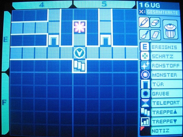 Im unteren Bildschirm, also im Touchscreen, befindet sich eine Karte, die allerdings selber erstellt werden muss. Dazu kann man die Wände des Dungeons als Linien einzeichnen, der Boden kann je nach Geschmack selber eingezeichnet werden oder automatisch mit der Bewegung der Gruppe mit gezeichnet werden. Sonderorte wie Abbau- Sammel-oder Erntestellen (an diesen Stellen kann die Gruppen je nach Fähigkeiten mehrmals am Tag Beutestücke wie Metalle, Hölzer oder Pflanzen erhalten), Türen, Teleporter, Gruben oder Schätze können mit den jeweiligen Symbolen versehen und sogar frei beschriftet werden.