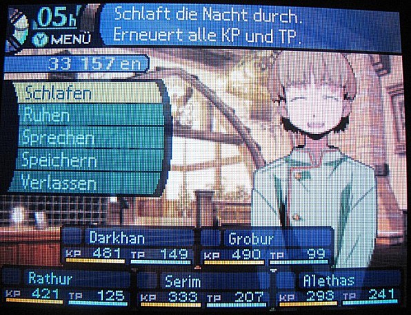 Etrian Odyssey bietet die gewohnt, bunte Mangawelt mit ihren typisch jugendlich bis kindlichen Charakteren und den skurrilen, farbenfrohen Gegnerschaften. Animierte Charaktere und Gegner gibt es hier nicht zusehen, überhaupt bewegt sich außer der Party Garnichts auf den Bildschirmen. Die Musik und die Soundeffekte sind mit ihren 8 bzw. 16 Bit Synthesizer Klängen klar eine Hommage an alte Zeiten, die genialen, 8 Bit Kampfgeräusche sind für mich hier der Höhepunkt in der Klangwelt. Das kratzige Pfeifen des Schwertes durch die Luft, das brutzelnde Geräusch des Feuerzaubers und das knarzige POW! des Explosionsgeräusches wenn ein Gegner stirbt sind einfach wundervoll anzuhören.